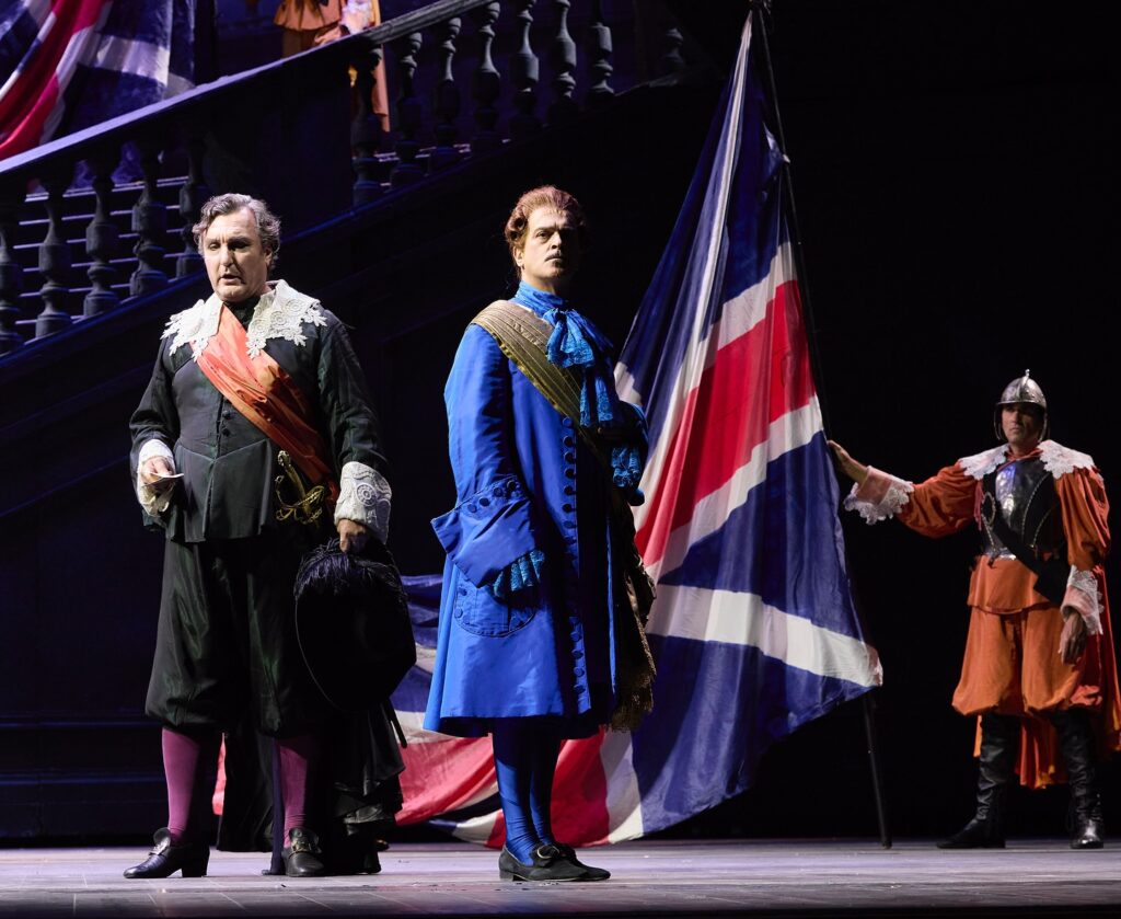 Mezzo-soprano Elizabeth DeShong plays the role of the fortune teller Ulrica with a dark voice, intrepid in descending to the G below the staff and easily rising to the high notes in the celebrated “Re dell’abisso affrettati,” sung with just the right mix of occult and mystery. Cassandre Breton‘s Oscar follows tradition, singing a petulant and impertinent pageboy who easily rises to the high notes and the picchettati. When there are great voices, it makes sense to propose a mise-en-scĂ©ne that disturbs as little as possible; trying to decipher the director’s undecipherable concept while Netrebko and TĂ©zier sing would be a crime. San Carlo has entrusted Massimo Gasparon with the revival of a famous 1989 production by Pierluigi Samaritani, which toured the world. It’s as traditional and faithful to the libretto as possible; no new ideas, no surprises but at least we’re spared the homosexual relations between Riccardo and Oscar, the prostitutes strolling through the “orrido campo,” and Ulrica doing teleshopping on TV channel. A decidedly vintage show, with its Union Jack flags, stylized trees, and pictorial references; the colorful costumes are beautiful, particularly Netrebko’s emerald green one in the third act.