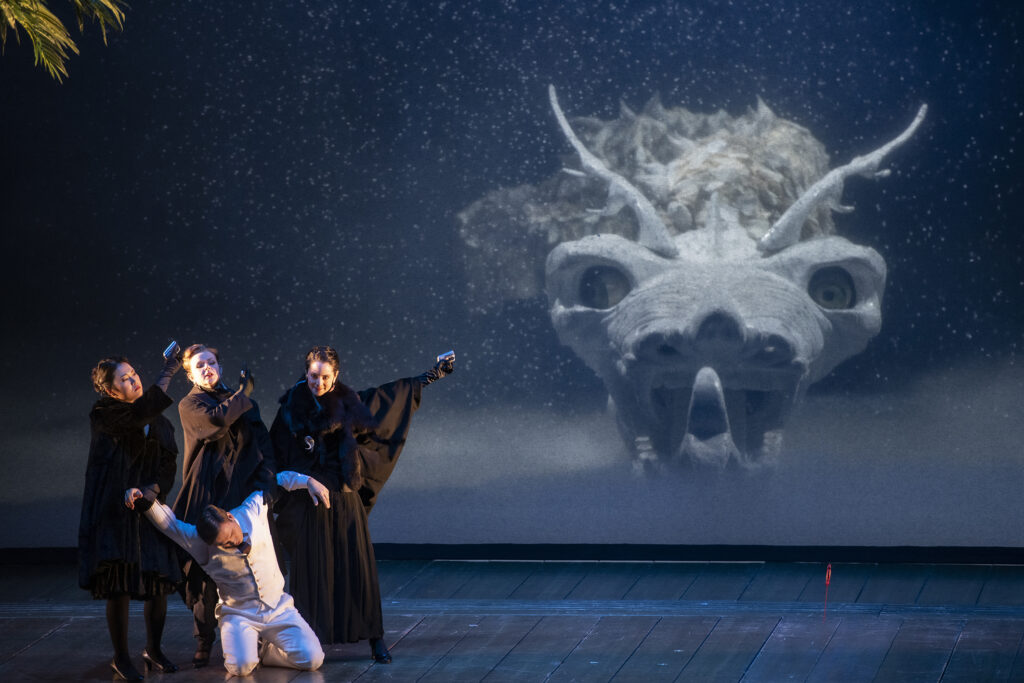 Artur Garbas has the task of bringing to life a Papageno who is full of life, brimming with humour, with a beautiful, rich, broad and warm voice. At his side, Hyejin Lee embodies a mischievous Papagena, delightfully amusing, with a sweetness and virtuosity that ensure the two singers complement each other perfectly. The handsome bass Tobias Kehrer brings Sarastro to life, valiantly attuning his beautiful vocal instrument to Mozartian elegance and grace. A very successful exercise, as his performances are deeply moving. The same can be said of the excellent Padraic Rowan’s portrayal of the Sprecher, while Benjamin Dickerson and Jörg Schörner rise to the challenge of bringing the expected touch of buffoonery to their respective roles as 1. Priester and 2. Priester – something we also see in Burkhard Ulrich’s remarkable entrance as Monostatos. We also salute the performances of Hong-Kyun Oh (1. Geharnischter) and Volodymyr Morozov (2. Geharnischter), who contributed to the success of this wonderful evening.