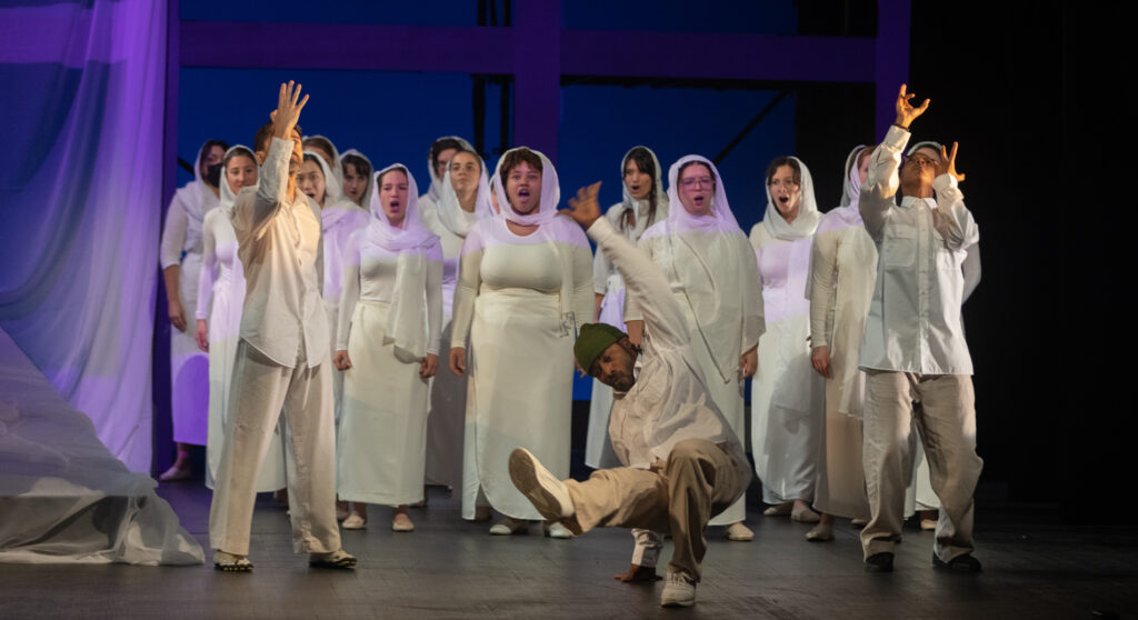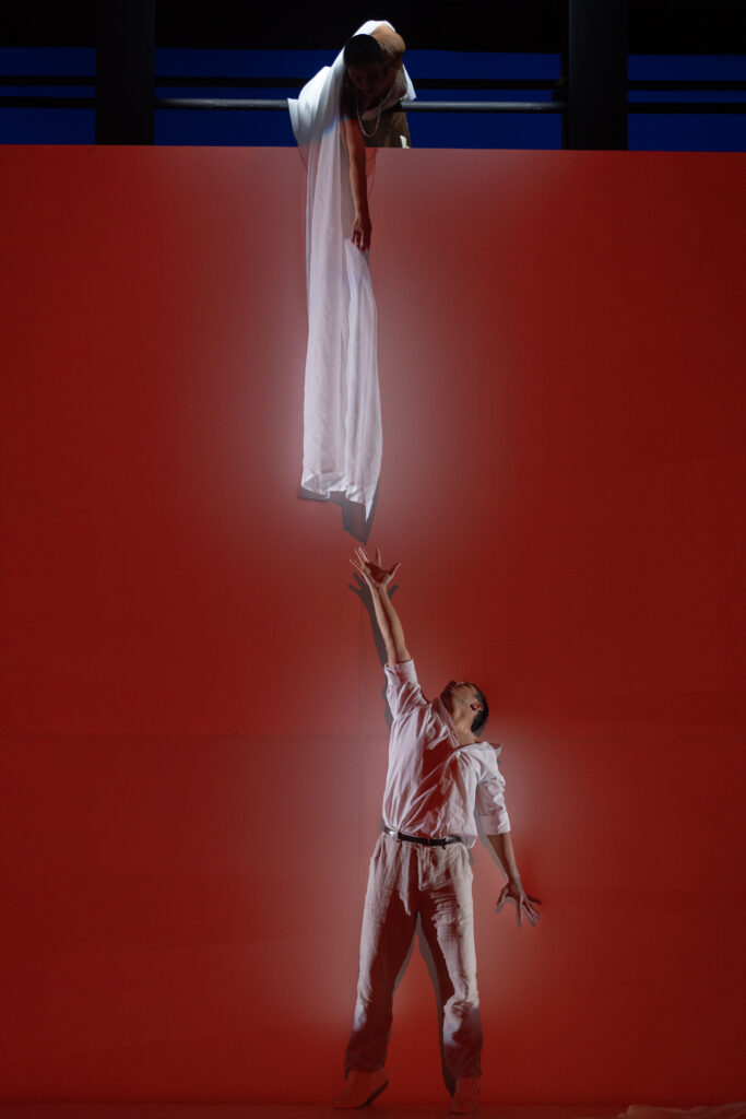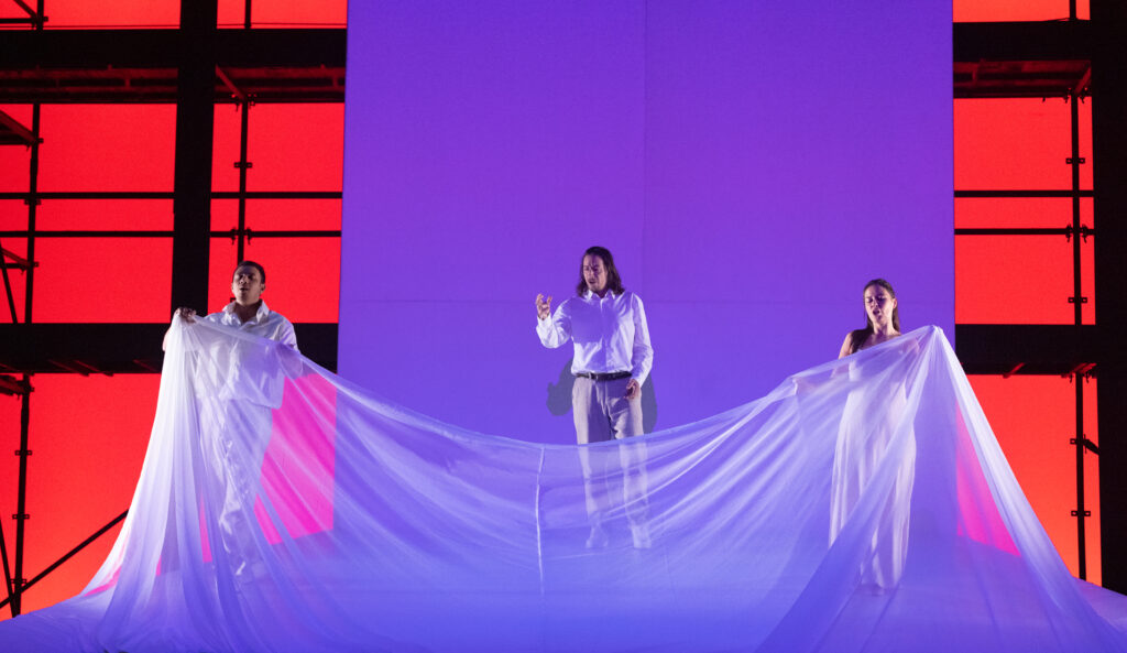 Eric Perez offers a pared‑down staging, setting in dialogue a reality that might be likened to present‑day Ceylon with the universal poetry of the work. A single set, where the enchanting play of lights (by Joël Fabing and Simon Gautier), the video projections (Clément Chébli), and the graceful movements of a veil, embodying both tangible elements (the sand, its shifting motion) and impalpable ones (Leïla’s purity, her dreams and those of Nadir), suffice to establish the scenic splendour. As the score itself suggests dance, it is only natural to introduce dancers upon the stage: a pleasing idea to call upon the Compagnie par Terre, whose urban dance incarnates the figures evoked by the intoxicating chorus of the Atelier Lyrique de l’Opéra de Massy, joined by Fiat Cantus. Here too, the balance is masterfully assured, with the gift of creating an ethereal soundscape in their off‑stage interventions (Le ciel est bleu ! La mer est immobile et claire !), or else unleashing a murderous force when they proclaim Le jour bientôt va poindre aux cieux !