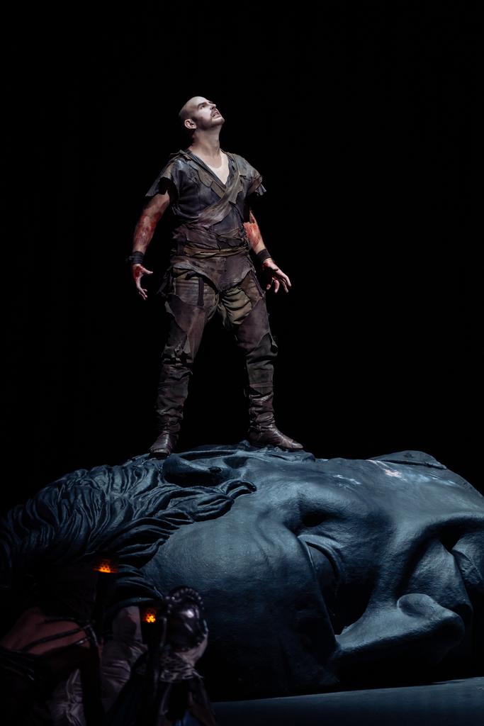 Dominating the stage stands a towering, anthracite‑grey statue, decapitated and monumental, eclipsing any evocation of the palace where Castor’s sister holds court. Not far from it lies the severed head of the condemned man: Agamemnon. As an allegory of the tomb invoked in the libretto, it is around the statue’s feet that the drama unfolds: the altar of Klytämnestra’s sacrifices, the site of Elektra and Orest’s reunion… Ropes are drawn into play, on which the characters haul themselves and one another, binding them together in a web whose dark epicentre is the king murdered in his bed, until Agamemnon’s daughter is finally strangled in the throes of her cathartic dance.