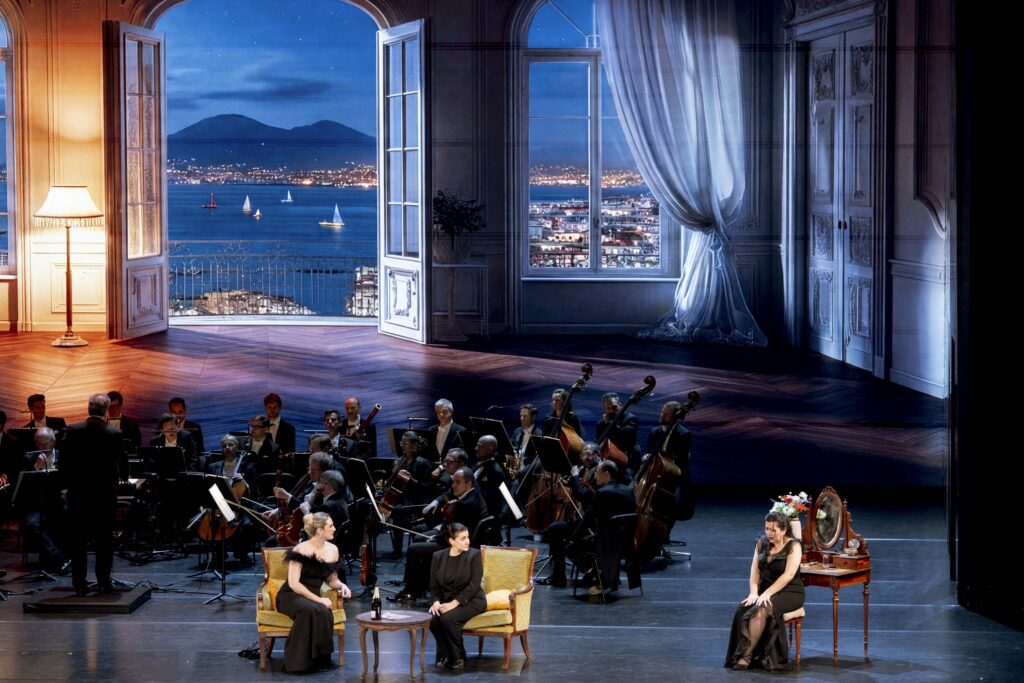 The opera was presented with a beautiful “mise en espace” by Lisa Padouvas, a Viennese director of Greek origin. The orchestra was positioned on the large stage of the Grimaldi Forum, against a backdrop of video projections and with the stage props in the foreground; the setting was contemporary and thoroughly Neapolitan, a city that in Mozart’s time was the capital of music and opera buffa. Despina’s very name is a precise reference and homage to Serpina, the protagonist of Pergolesi’s La Serva Padrona. The café where the opera opens becomes the “giardino della Fesseria,” a double entendre à la Da Ponte, considering that in Neapolitan “la fessa” is the female genital organ. The two sisters’ home is a villa in Posillipo neighbour with a stunning view of the gulf, with the lights gradually shifting to a fiery sunset. The modern-day setting doesn’t distort the plot, and some of the scenic ideas are pleasant, such as Ferrando and Guglielmo dressing up as rappers instead of Albanians.